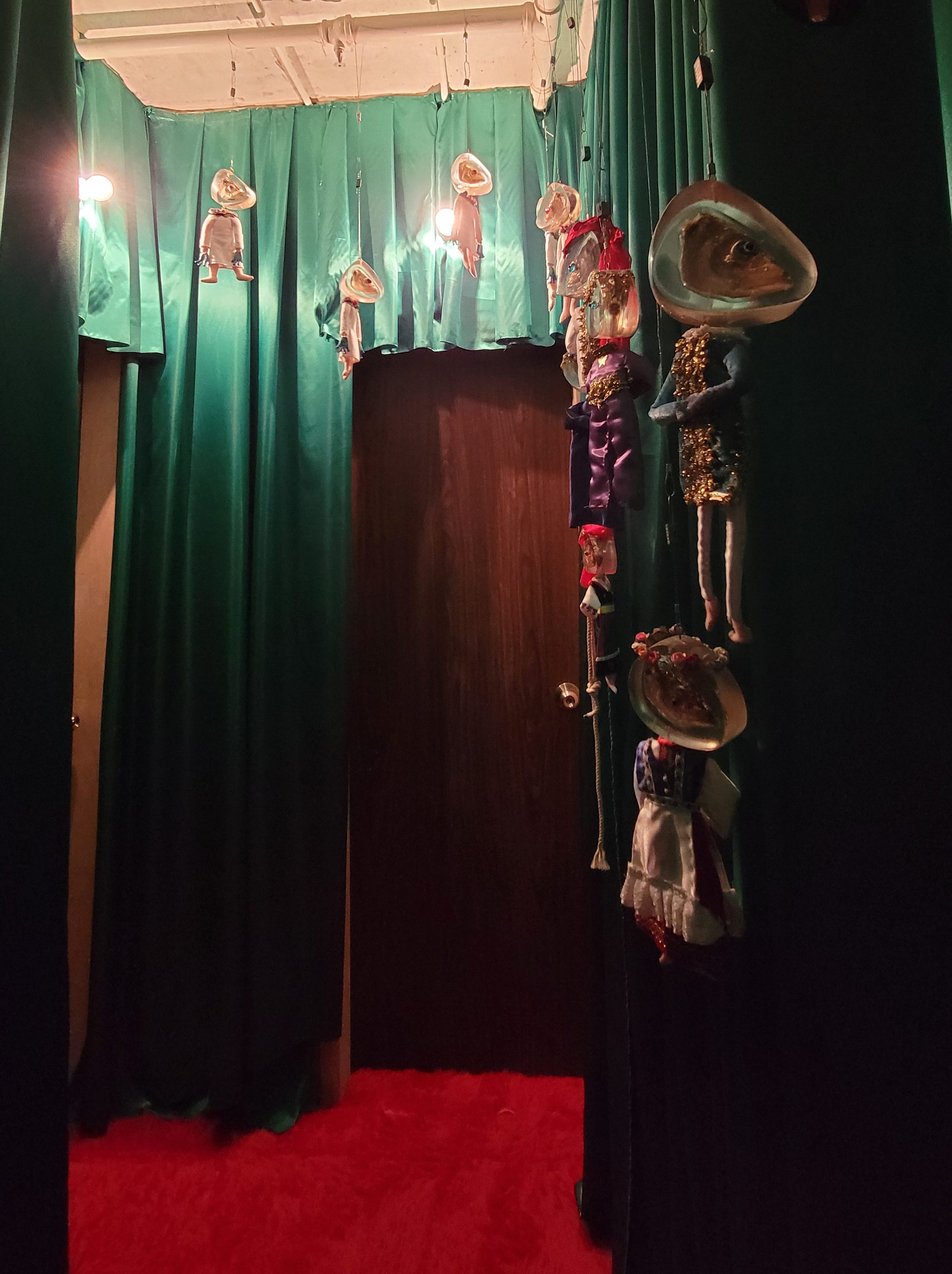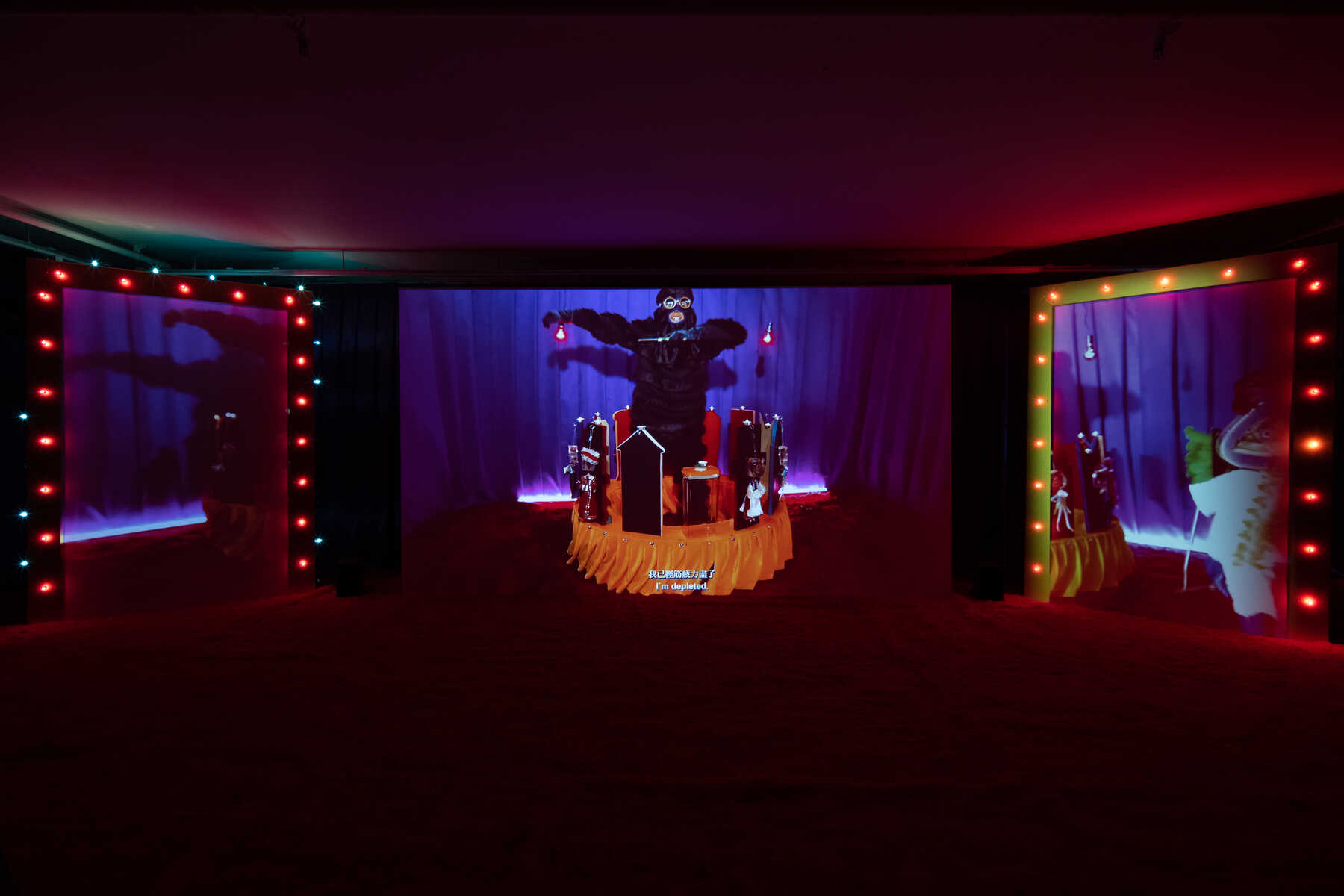Planaria, in particular, is an exhibition that looks into death as a universal experience in a sociocultural context. In the three-panel video installation, puppets with preserved fish heads are dressed in traditional costumes of countries with the highest suicide rates. However, these hybrid looking dolls do not kill themselves in the video; instead, three cartoonish creatures with googly eyes, buck teeth and black fur suits ritualistically perform various ways of dying on the dolls, and then place them on what looks like an altar. Humorous in appearance, they suggest an unfathomable force behind these different causes of death. In the end, the fish-head dolls turn into angels, traditional costumes being replaced by typical white dresses.